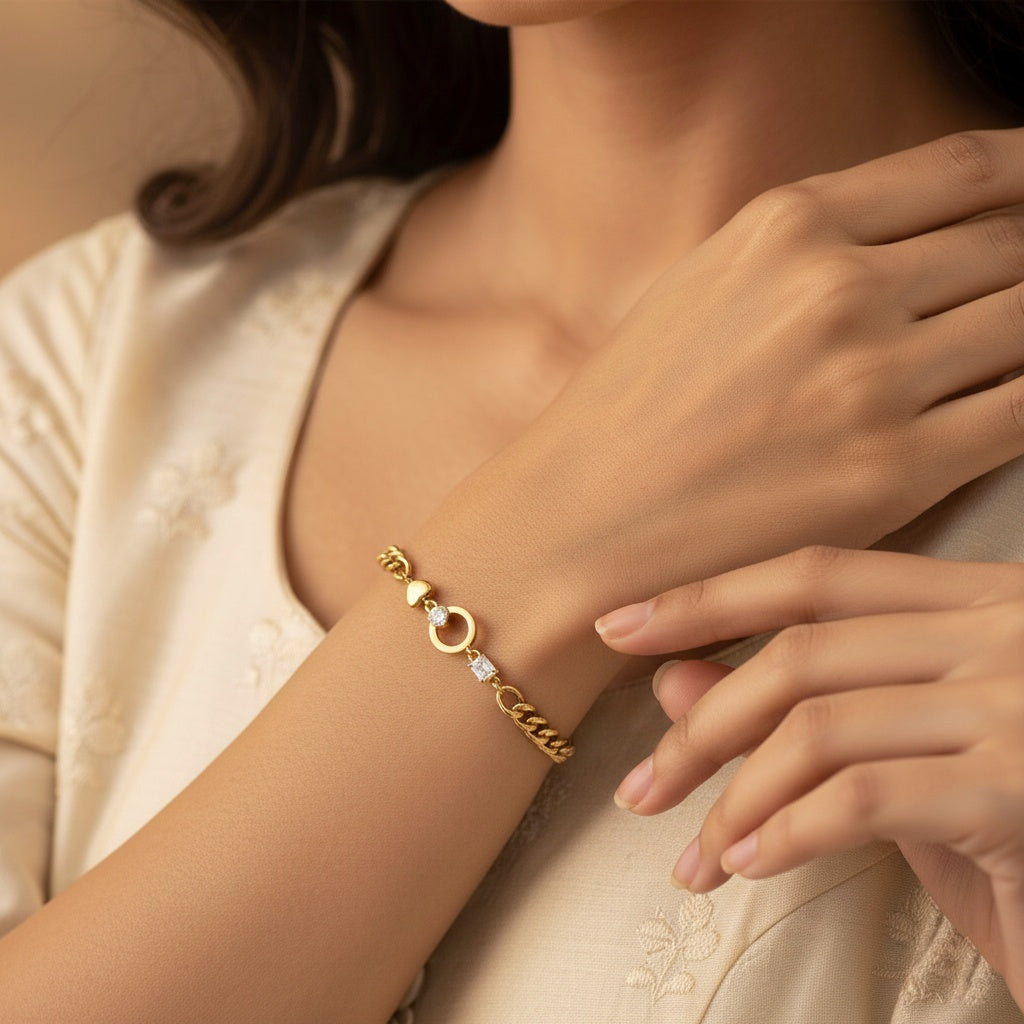 Add a touch of elegance and charm to your style with our Link Stone Gold Bracelet. Crafted with a sleek chain design and adorned with sparkling stones, this piece is perfect for everyday wear or special occasions. š